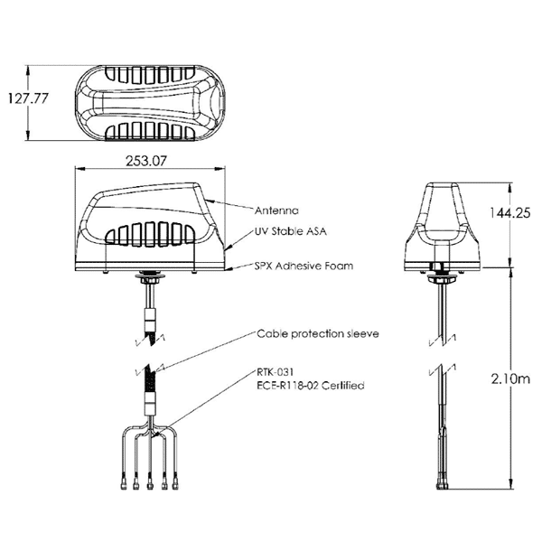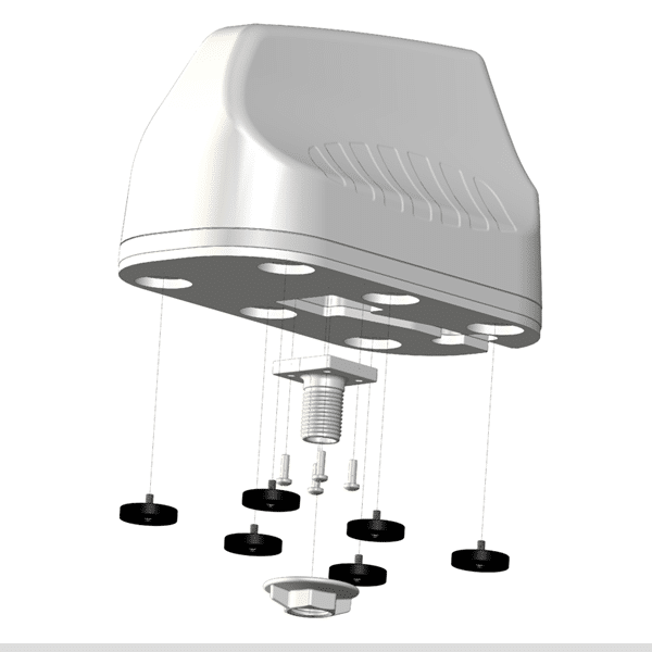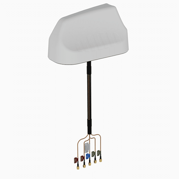 The antenna provides two separate dual-band Wi-Fi antennas, providing concurrent 2.4GHz and 5GHz on each antenna with 2×2 MIMO capability. The fifth antenna is a high-performance active GPS/GLONASS system operating down to -40 degrees. The antenna exceeds the performance of most competitors due to the attention to the design of this high-performance antenna. The radiation patterns of all radiating elements provide an excellent balance between omnidirectionality, pattern diversity and good radiation abilities at the desired elevation, which is important for this type of antenna, especially for the transportation and marine market. Main applications are for commercial/industrial vehicles, marine, M2M and other IoT systems using a wide range of radio technologies, while remaining futureproof over the wide frequency band offered by this antenna.